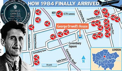 The great Syntax of Things points out this article that explains there are thirty-two surveillance cameras within 200 yards of 1984 author George Orwell's flat.